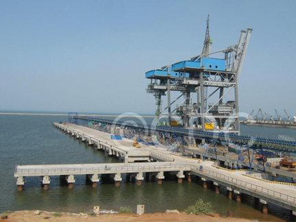 The project comprises of 120m long x 10m width approach, 350m long x 30m wide Main jetty and 62m long x 15m width RO-RO jetty | The responsibilities included preparation of design calculation and drawings of 120m long approach for vehicular traffic and conveyor trestles on RCC deck with precast beams supported on 1100 mm dia cast-in-situ piles,350m long main jetty designed to accommodate 250000 DWT vessels, Drive House and Take up Tower with conveyor trestles on RCC deck precast beam system rested and supported on 1300 dia cast-in-situ piles and 62m long RO-RO jetty for 17200 DWT RO-RO vessels with RCC deck with precast beam system supported on 1200mm dia cast-in-situ piles. |